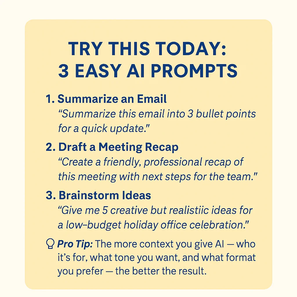 AI isn’t the future; it’s already part of the workplace. Used thoughtfully, it can lighten your workload, boost creativity, and maybe even give you a few extra minutes to enjoy your coffee before the next meeting.